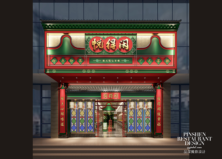 8、門頭形象:門頭是品牌的臉面,也是顧客接觸我們的第一個場景。門頭形象具有廣而告之的作用,門頭代表著餐廳的名字叫什么,賣的產品是什么,這是最基本且不可或缺的要素。門頭完全可以作為全方位展示店特色的工具,巧妙的組合可用信息向客戶發(fā)送品牌信息,從而引發(fā)客戶興趣。悅得閑廣式點心茶樓的門頭大量使用鑊耳山墻,讓廣式茶樓的特性展露無遺。