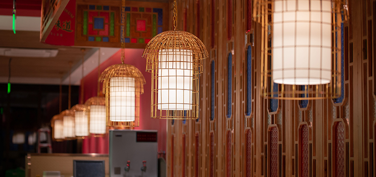 上海寶粵樓廣式點(diǎn)心茶樓,該空間的吊燈就是仿老廣州人提籠遛鳥喝早茶的情形,將鳥籠做成了吊燈造型,與品牌整體氛圍融為一體。