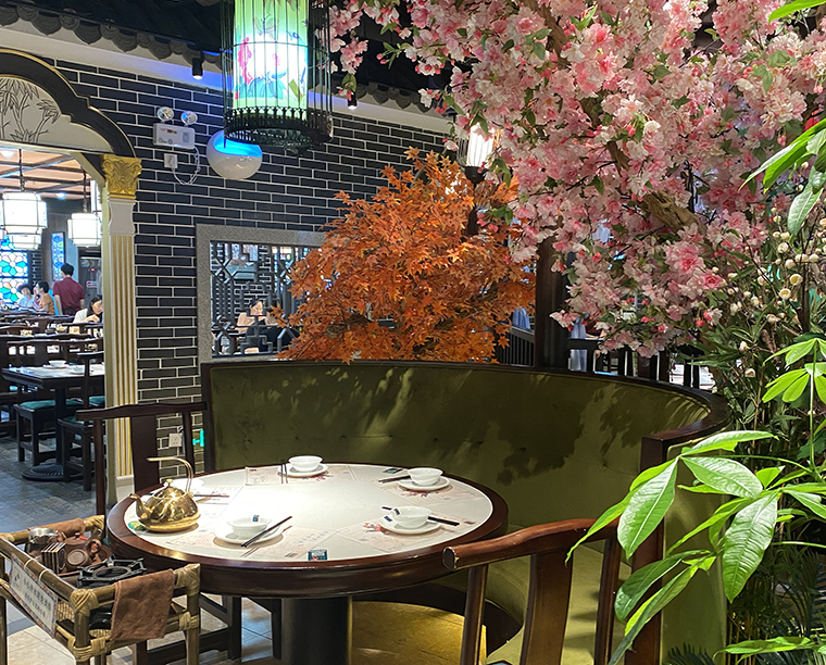 5、花藝綠植。綠化是室內(nèi)設(shè)計(jì)中經(jīng)常采用的裝飾手段,幾乎所有的餐飲空間都有綠化的裝扮。綠化在餐飲空間中的運(yùn)用非常廣泛,不同的餐廳,花藝綠植的應(yīng)用差別很大。一般的餐廳面積有限,綠植和花藝使用較少。主題類中餐廳,花園餐廳喜歡使用大量的花藝綠植,為了方便打理,花藝綠植都選用塑料花。品深設(shè)計(jì)策劃設(shè)計(jì)的蘩樓全天茶市,二小姐的店,都使用了不少花藝。其中二小姐的店選用的就是粉紅桃花,營(yíng)造出了小橋流水,江南小鎮(zhèn)的感覺(jué)。