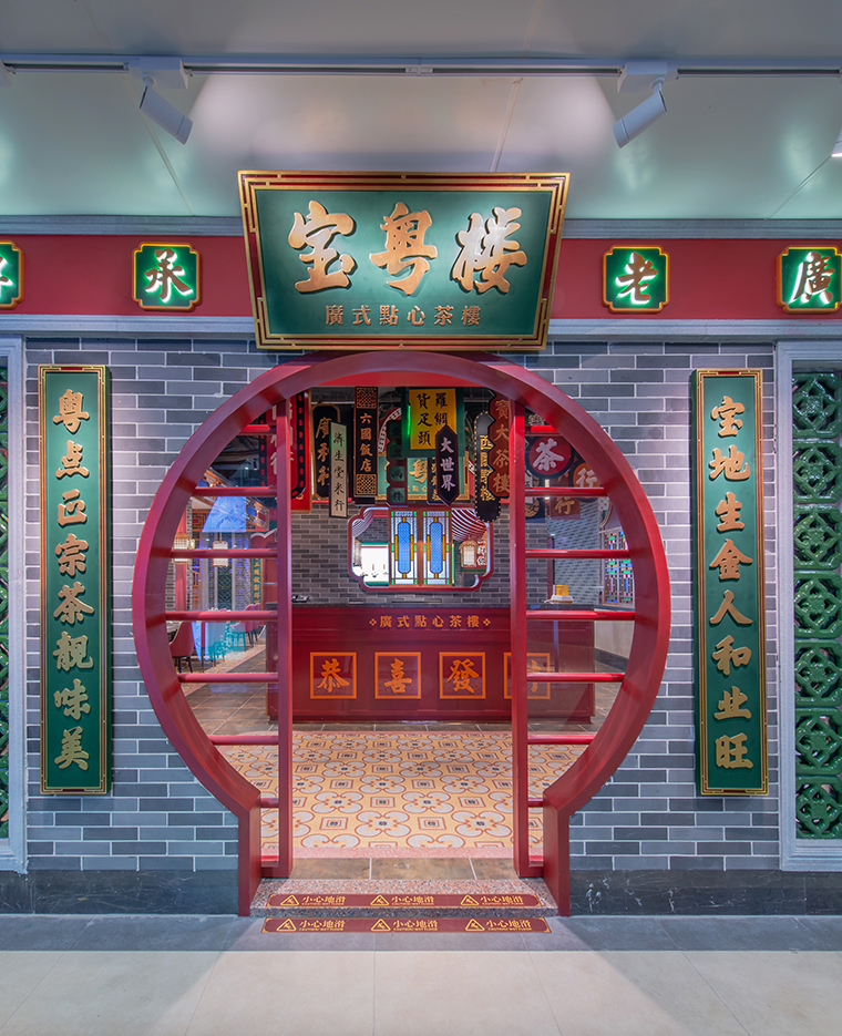 ;收銀臺上方吊著的各種就是店招,店旗,很好的傳達了品牌的悠久歷史;墻面的各種原創(chuàng)畫面,金屬發(fā)光字、各種匾額對聯(lián)、天花上的剪紙圖形,各種元素多而經(jīng)典,雜而不亂。品深餐飲全案設(shè)計團隊從不同的角度,用不同的元素,以非常有序且充滿了趣味的方式傳達出寶粵樓品牌的老廣州西關(guān)文化特性。
