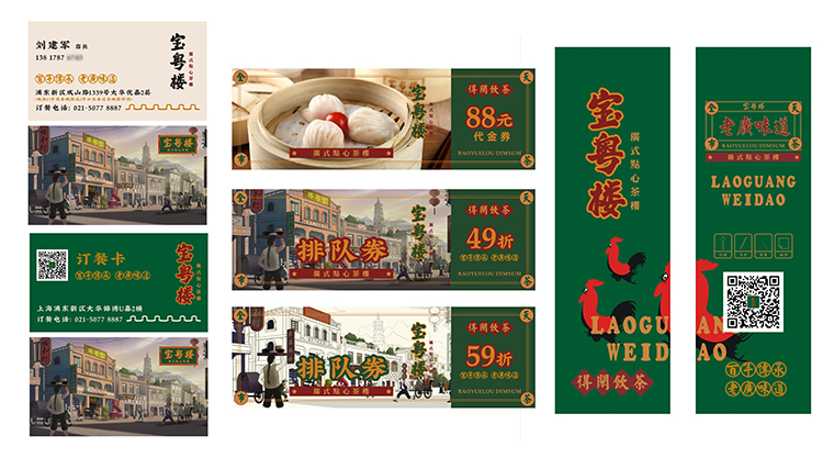 ”這一識別度高,歷史感強,且符合點心茶樓這一品類特性的匾額樣式設(shè)計變化成寶粵樓的標(biāo)志LOGO圖形。綠色的匾額,金色的字體,用金字招牌的形式把寶粵樓的歷史內(nèi)蘊完美表現(xiàn)出來。我們將寶粵樓的主體色定為紅色和綠色。其中紅色使用的面積最大,大量出現(xiàn)在空間裝飾裝修中,綠色則主要出現(xiàn)在各種物料應(yīng)用設(shè)計中。深綠色在老廣州西關(guān)的古建筑中,出現(xiàn)的頻率很高,是非常具有歷史厚重感的一種色彩。