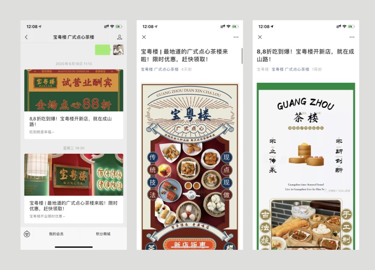 其他的VI如店內(nèi)日常運營的物料系統(tǒng),導(dǎo)視系統(tǒng),推廣廣告系統(tǒng),品深餐飲設(shè)計團隊力圖整體空間與品牌完整統(tǒng)一,精細(xì)到連顧客接觸最多的墊餐紙、點餐單、使用的功夫茶具、員工的工衣胸牌、圖片的風(fēng)格,全部統(tǒng)一在寶粵樓的品牌文化體系之內(nèi),給顧客以視覺整齊劃一又靚麗多變的美學(xué)感受。