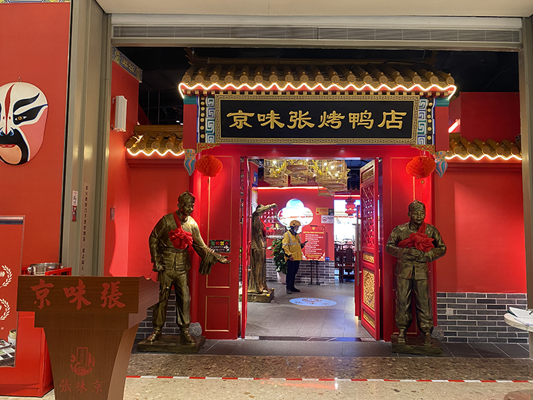 品深設(shè)計全案升級的京味張烤鴨店,是北京菜的代表品牌,整個門面采用大面積中國紅,非常鮮明,醒目。消費者可以用一句話就表達(dá)出來:整個門面全部是紅色那個餐廳。這就很好被消費者傳播了。色彩色調(diào)搭配在門面設(shè)計、門頭設(shè)計中需要重點考慮,合理搭配。