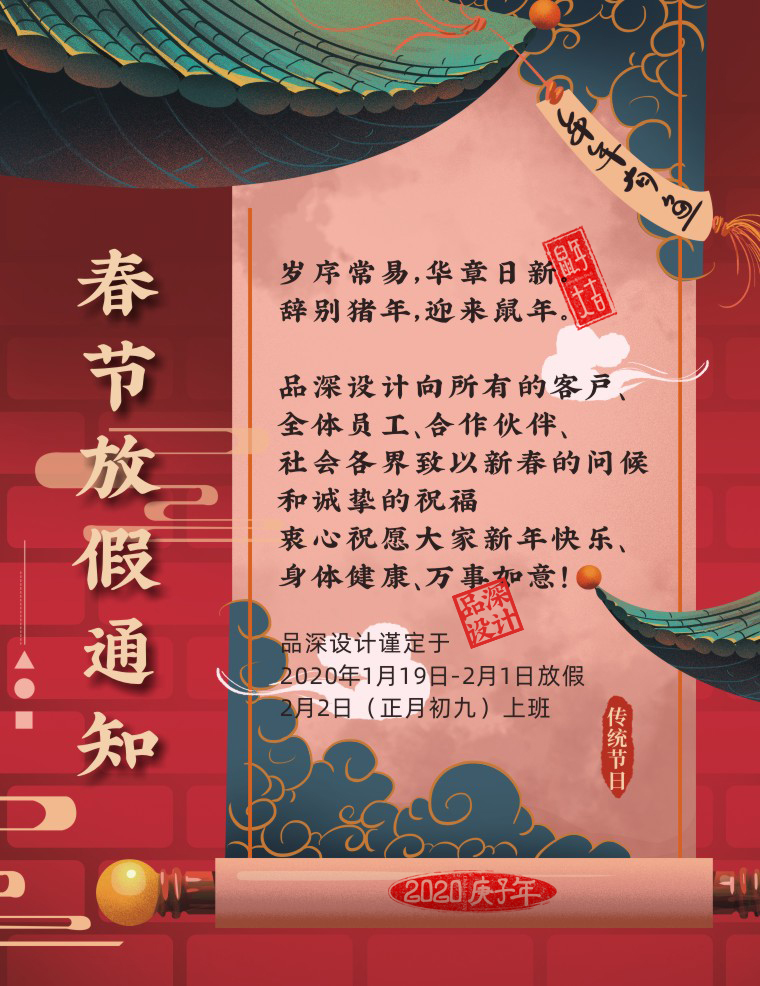 品深設(shè)計謹(jǐn)定于2020年1月19日(臘月25)正式放假,2月2日(正月初九)上班。