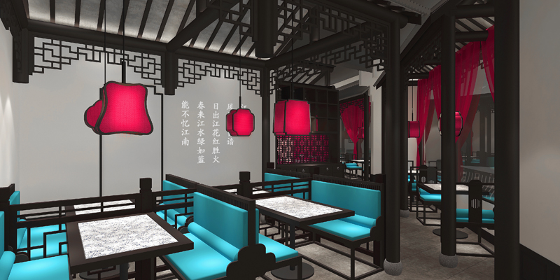如:品深餐飲設(shè)計(jì)過的二小姐的店,從蘇杭古典園林中獲取靈感元素,將江南園林中“連廊”的建筑形式引入項(xiàng)目空間中,并與不同的座椅形式完美組合,營造出室外廊下的用餐體驗(yàn)場景化的設(shè)計(jì)。將江南的粉墻黛瓦,飛檐翹角,通過剪影化的設(shè)計(jì)手法,成為空間立面的裝飾造型元素。長形的沙發(fā)座椅靠背設(shè)計(jì)借鑒江南建筑的欄桿造型(又稱美人靠),與背景的建筑剪影形成形式的完美統(tǒng)一。并將江南的水色山光,山嵐煙云,通過淡墨山水的形式移植進(jìn)餐廳的墻面,作為整個(gè)餐廳的背景,