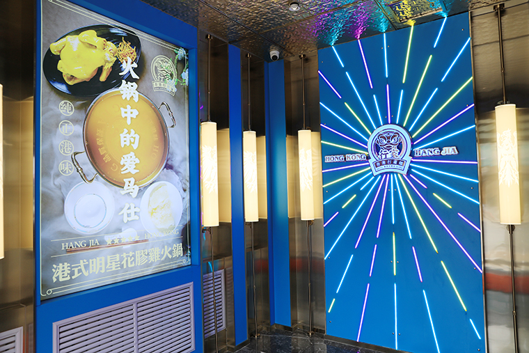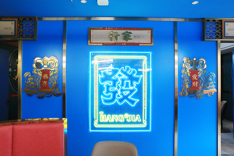 餐廳的主入口處,人流最密集之地,也是品牌首選的亮相之處。展現(xiàn)品牌主形象LOGO,以香港常見的霓虹燈材質(zhì),四周放射性線條,極具識(shí)別度,既有鮮明的港式風(fēng)格,又能吸引消費(fèi)者打卡拍照分享;上樓梯處再用不銹鋼金屬字強(qiáng)調(diào)品牌名字“我就是行家”;1樓大廳一整面墻的香港城市景色照片,讓消費(fèi)者有一種身臨其境的感受;二樓大廳正面形象墻以行家牌匾+立體浮雕醒獅,最經(jīng)典的港式匾額傳達(dá)花膠雞悠久厚重的歷史,兩側(cè)喜慶的南派醒獅,吉祥又可愛,與品牌LOGO彼此呼應(yīng)。