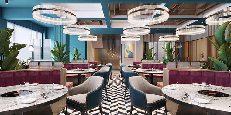 整體氛圍去掉繁雜多余的線條,多用皮質(zhì),不銹鋼材質(zhì),呈現(xiàn)精致,高品質(zhì)的用餐氛圍!空間的整體照明燈光以柔和面光為主,餐桌上方局部聚光燈照明,突出火鍋湯底的特色,金黃明亮;特色的吊燈,讓空間層次鮮明,港風(fēng)濃郁。家具以皮革為主,金屬收邊,加上小屏風(fēng)讓空間感更通透,能表達(dá)出輕奢的質(zhì)感。